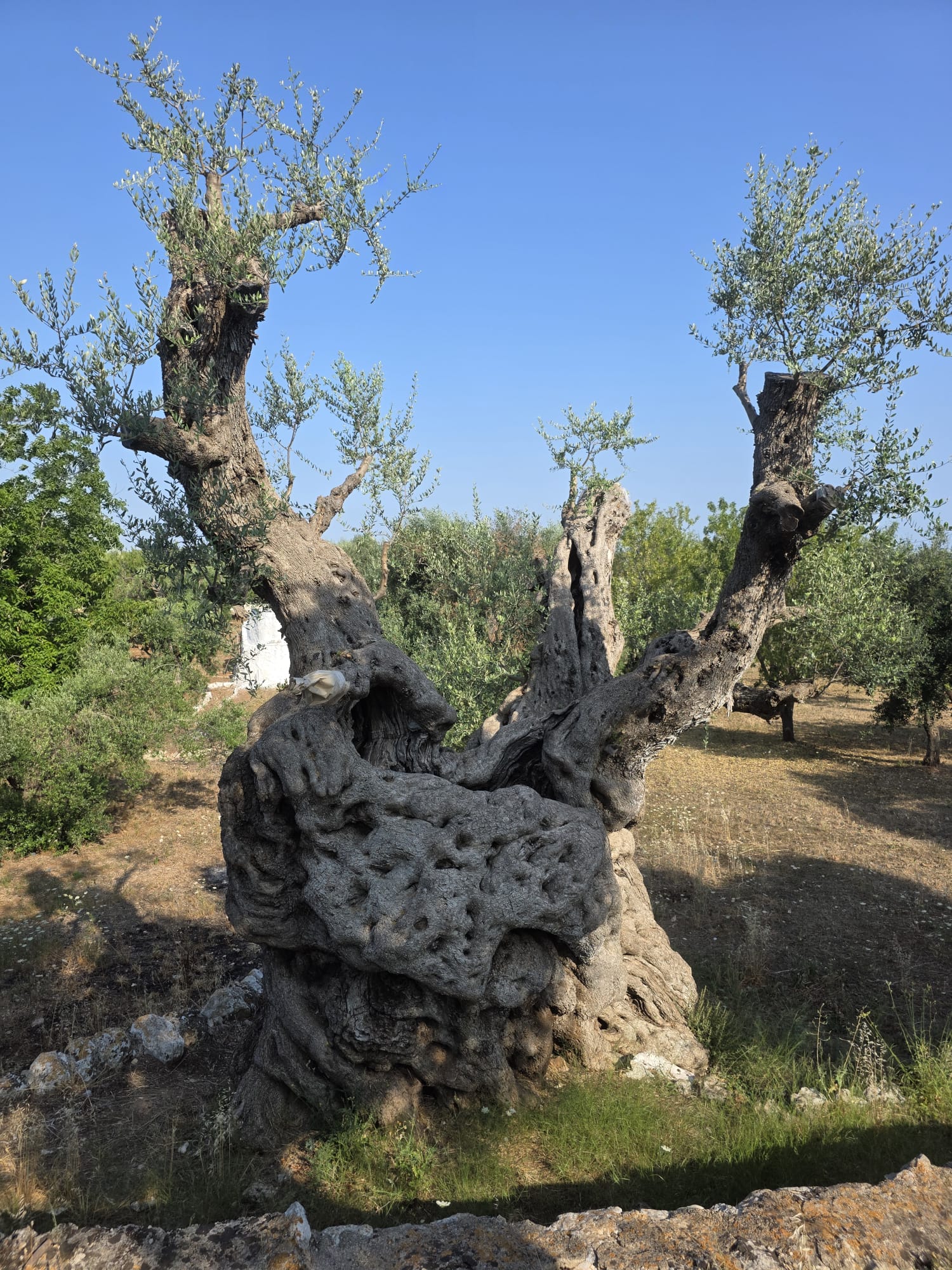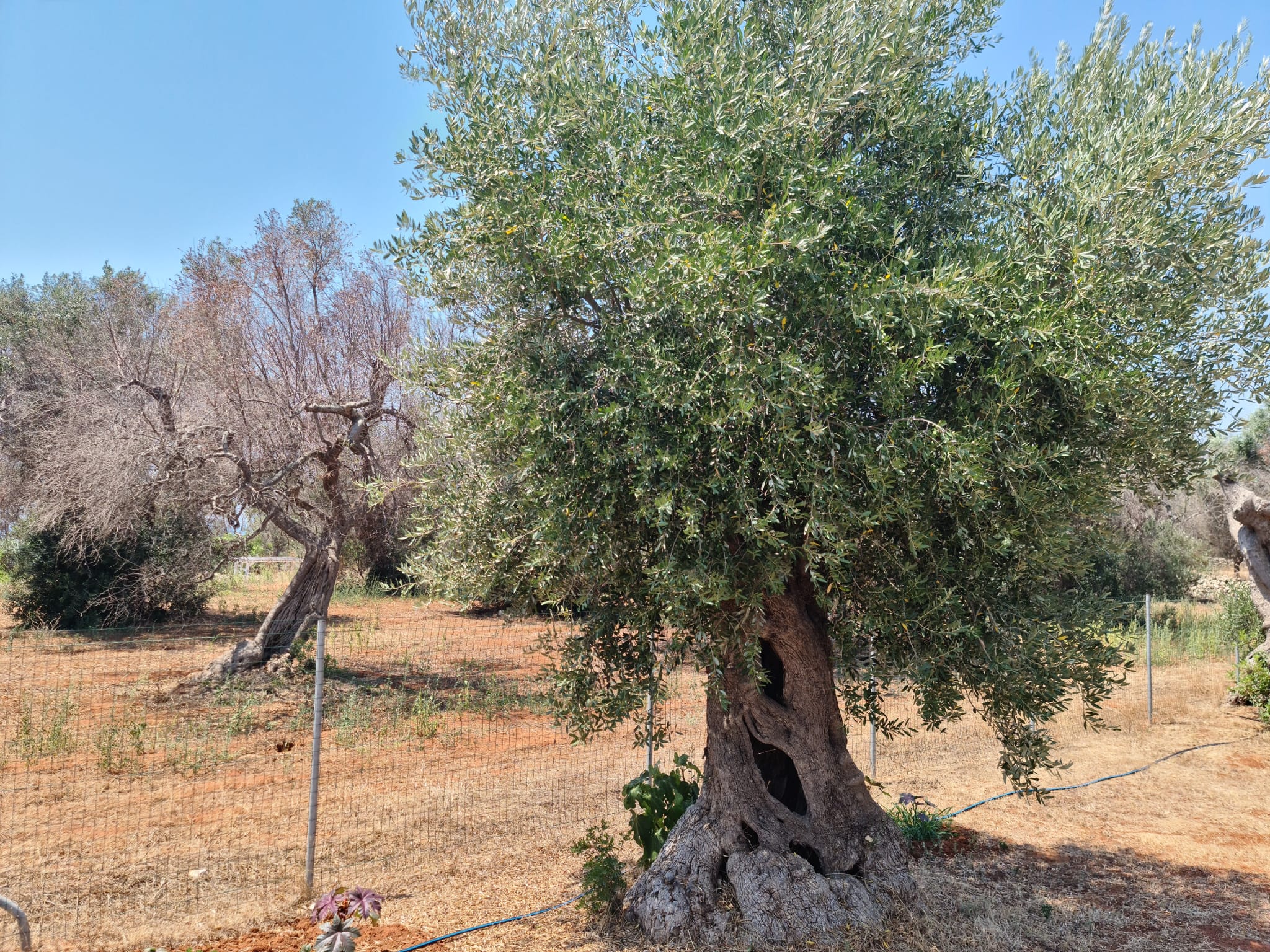 Il sovrainnesto (o reinnesto) si conferma la tecnica principale per preservare il valore monumentale e paesaggistico delle varietà sensibili come l’Ogliarola e la Cellina di Nardò di cui esistono migliaia di alberi secolari in molte aree salentine non ancora eccessivamente compromesse dall’infezione. L’obiettivo è sostituire la chioma infettabile con cultivar resistenti/tolleranti che la ricerca e la sperimentazione hanno reso disponibile: Leccino, FS-17 (Favolosa), Lecciana e Leccio del Corno. Numerose osservazioni pluriennali confermano la superiorità dell’innesto a triangolo (o a tassello) rispetto a quello a corona, poiché garantisce una stabilità superiore, fondamentale per ridurre i rischi di sbrancamento a causa di forti venti. L’esperienza di questi anni, inoltre, ha evidenziato che l’innesto su piante già infette, pur attecchendo, subisce un rapido collasso della struttura vascolare e un rallentamento della crescita dei nuovi germogli; è pertanto sconsigliabile.