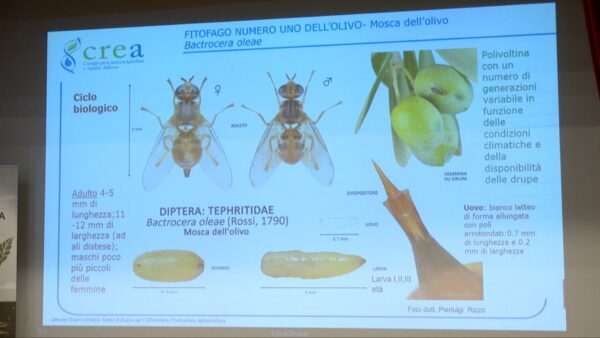 L’intervento di Veronica Vizzari del CREA (Centro di Ricerca per l'Olivicoltura, Frutticoltura, Agrumicoltura sede di Rende -CS) coferma come la mosca dell’olivo, Bactrocera oleae, sia il principale fitofago della coltura nel Centro-Nord. Il danno diretto è causato dall’attività larvale all’interno della drupa, con perdite produttive e decadimento qualitativo dell’olio.