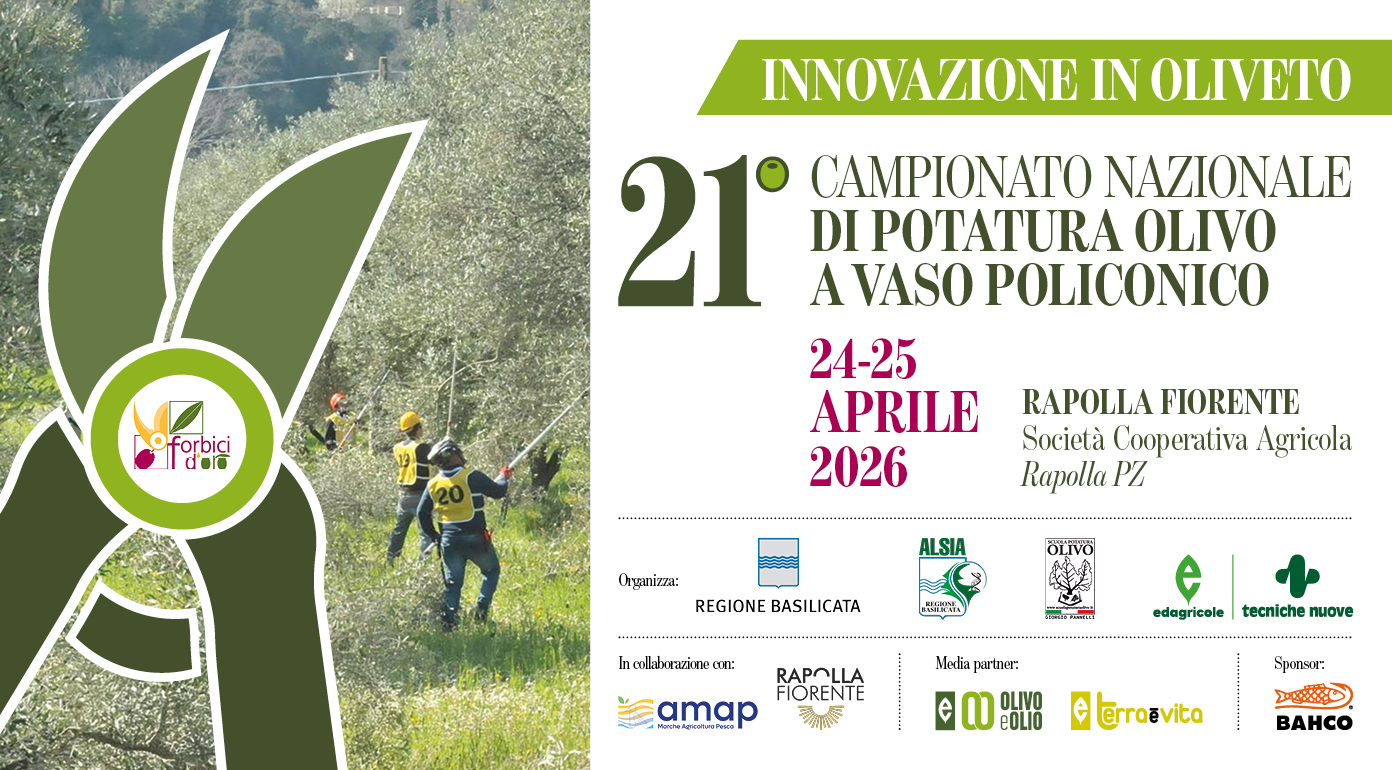 Nell’ambito dell’evento Innovazione in oliveto, a cura di Edagricole, Regione BASILICATA e ALSIA , con la collaborazione di Amap e Rapolla Fiorente, si terrà il 21° Campionato Nazionale potatura dell’olivo allevato a vaso policonico "FORBICI D’ORO", quest'anno organizzato dalla Scuola Potatura Olivo “G. Pannelli”.