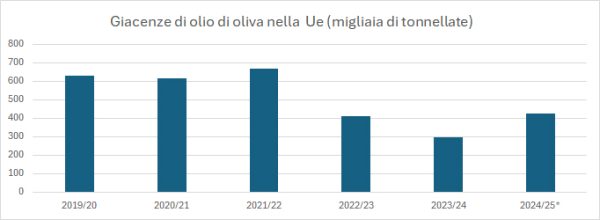 Se sulla produzione c’è ancora molta incertezza, si ha invece più certezza delle giacenze nella Ue che secondo gli ultimi dati della DG Agri, infatti, sono stimate a circa 423 mila tonnellate, in netta crescita rispetto al finale di campagna 2024/25 ma comunque al di sotto della media delle 4 campagne precedenti.