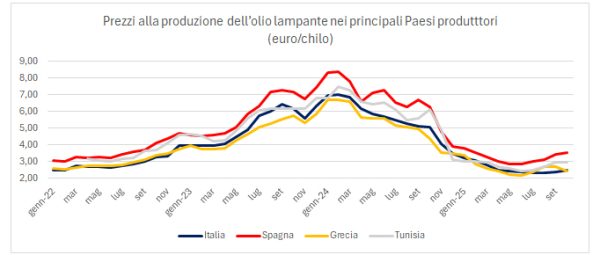 Molto più nella norma la dinamica del mercato del lampante. A una maggiore disponibilità della campagna 2024/25 i listini sono scesi a partire da quelli del prodotto spagnolo che si è portato verso il basso anche quello di Italia, Grecia e Tunisia. Le ultime rilevazione attestano l’olio lampante iberico a 3,50 euro al chilo, mentre i listini dei prodotti dei paesi competitor sono al di sotto di questo livello.