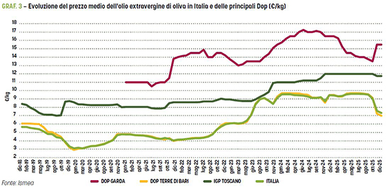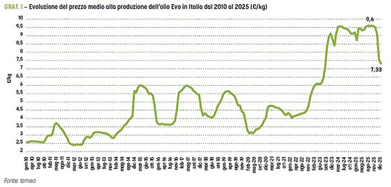 I prezzi dell’olio extravergine di oliva sono passati da 9,6 euro/kg del mese di settembre 2025 a 7,3 euro/kg del mese di dicembre 2025, con una diminuzione di 2,3 euro/kg in soli 4 mesi. Attualmente (gennaio 2026), il mercato è in una fase di stallo e di incertezza, in attesa di informazioni più affidabili sulle produzioni di olio di oliva nell’ultima campagna in Spagna, in Italia e negli altri paesi del Mediterraneo; a ciò si aggiunge l’incertezza legata alle regole commerciali dell’importazione dell’olio tunisino nell’Unione europea.
