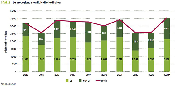 È noto a tutti che il forte innalzamento dei prezzi, a partire dal gennaio 2023 (graf. 1), è imputabile alla forte diminuzione dell’offerta che si è verificata nell’Unione europea, soprattutto a causa della forte siccità in Spagna, perdurata per due anni (2022 e 2023). Infatti, la produzione europea di olio di oliva nell’Ue è passata da 2.272 migliaia di tonnellate nel 2021, a 1.392 nel 2022 (-39%), a 1.532 nel 2023 (-33% rispetto al 2021), per poi risalire a 2.128 nel 2024 (graf. 2). Nel 2025, la stima di produzione dell’olio di oliva nell’Ue è di circa 2.000 migliaia di tonnellate, allo stesso livello della media decennale.